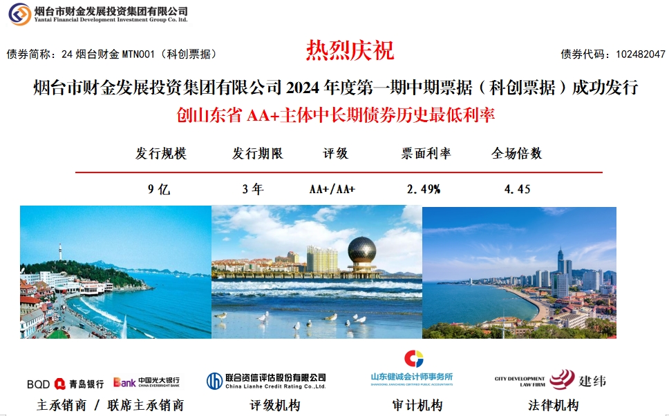 5月24日,煙臺財金集團2024年度第一期中期票據(jù)(科創(chuàng)票據(jù))成功發(fā)行。本次中期票據(jù)發(fā)行規(guī)模9億元,發(fā)行期限3年,票面利率2.49%,全場認購倍數(shù)4.45倍,創(chuàng)山東省AA+主體中長期債券歷史最低利率。